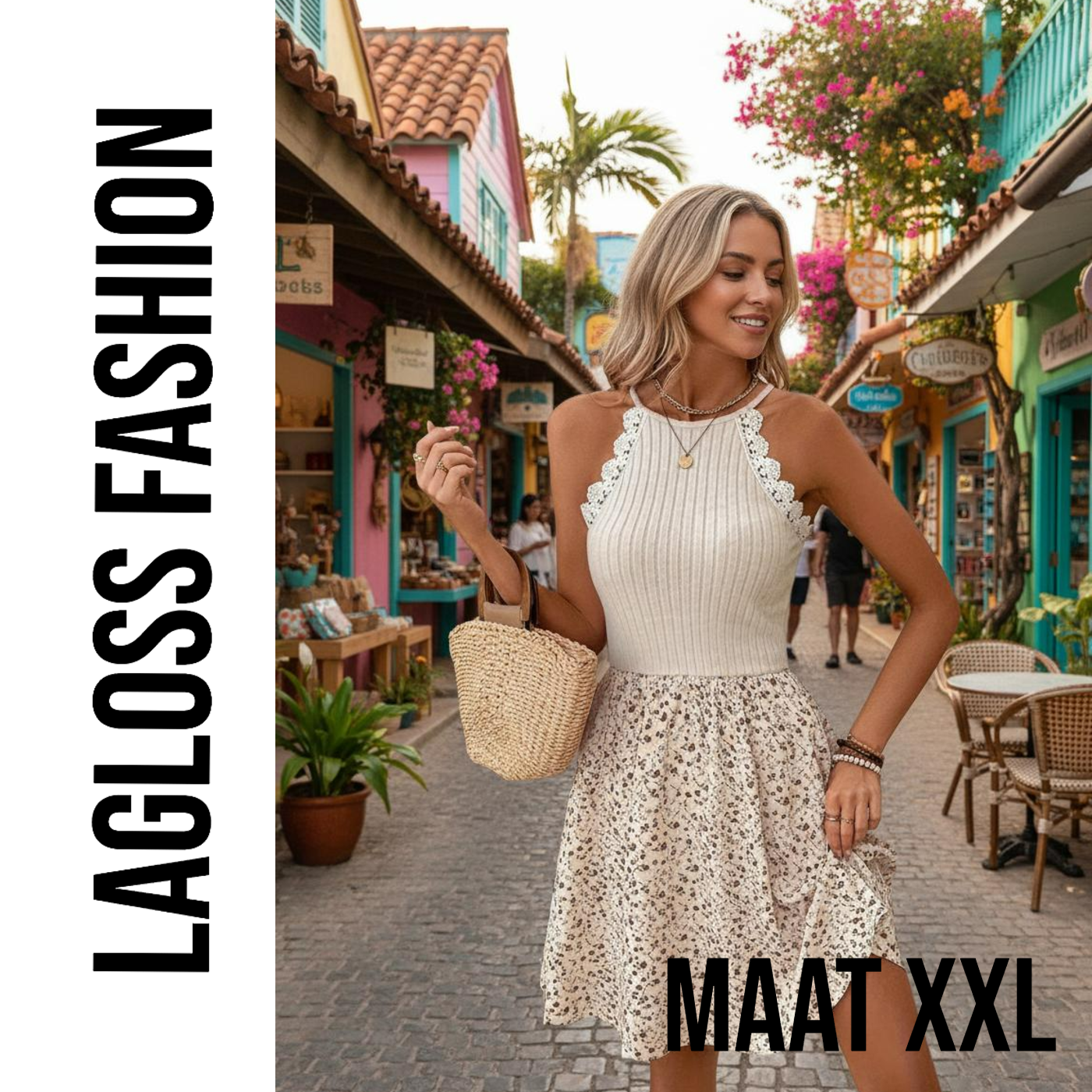 Straal elegantie en zomerse charme uit met de kanten halternek zomerjurk dames van LaGloss. Deze verfijnde jurk combineert een romantische bloemenprint met een vrouwelijke halternek en subtiele kanten details. Perfect voor warme dagen, strandwandelingen of een stijlvolle zomerse avond.