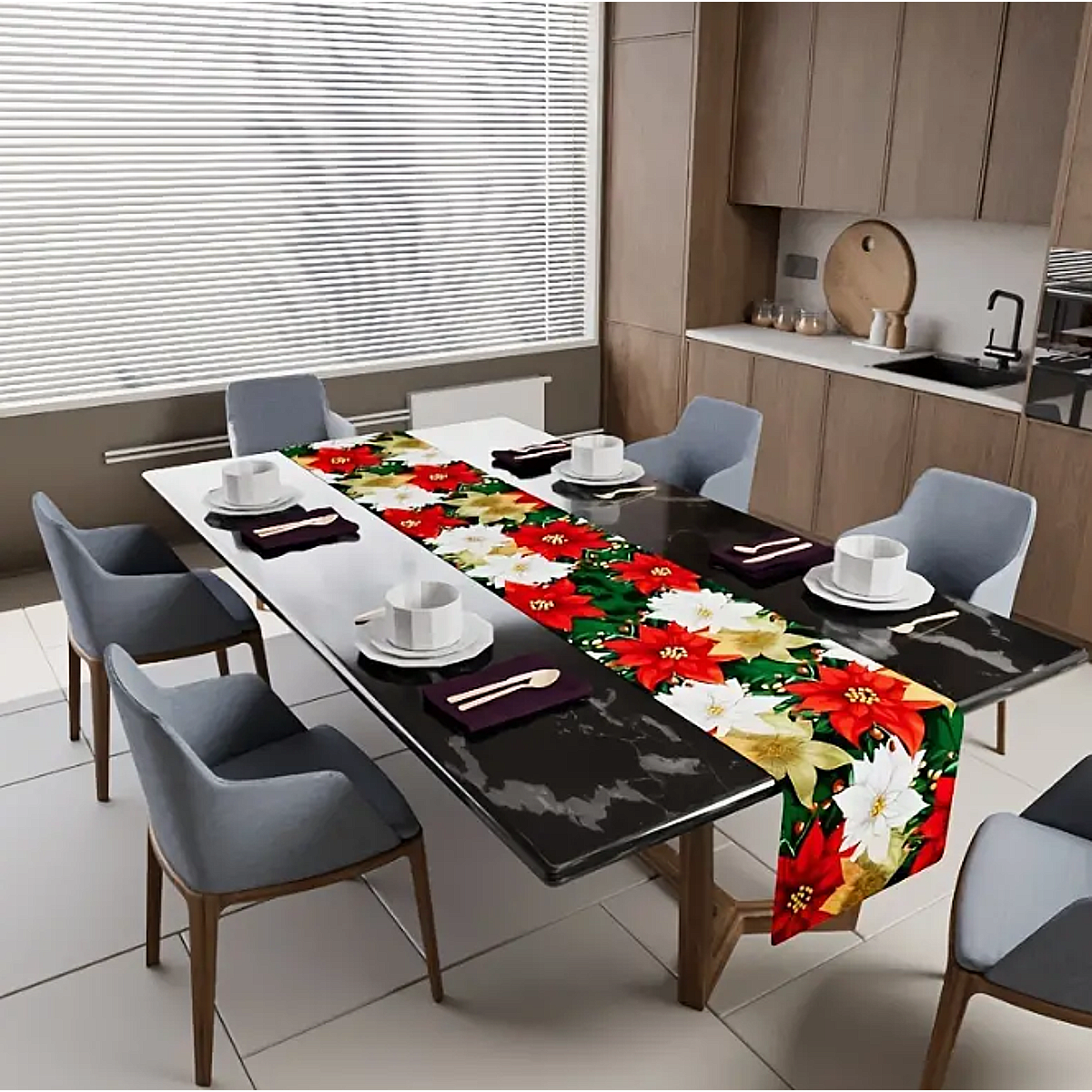 Niets roept een feestelijke sfeer op zoals een tafelloper met kerst items. Deze tafelloper is een geweldige keuze voor kersttafeldecoraties. Het sluit perfect aan bij traditionele kerstkleuren zoals rood, groen en wit. Combineer de loper met gouden servies, kaarsen of kerstversiering voor een betoverend kersttafereel.