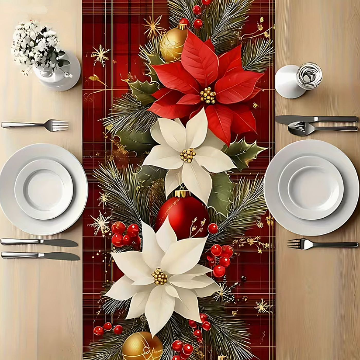 Kerst Tafelloper – Rood Geruit & Polka Dot Ontwerp met Dennenbomen, Bessen & Ornamenten – 33x183 cm – Feestelijke Tafeldecoratie