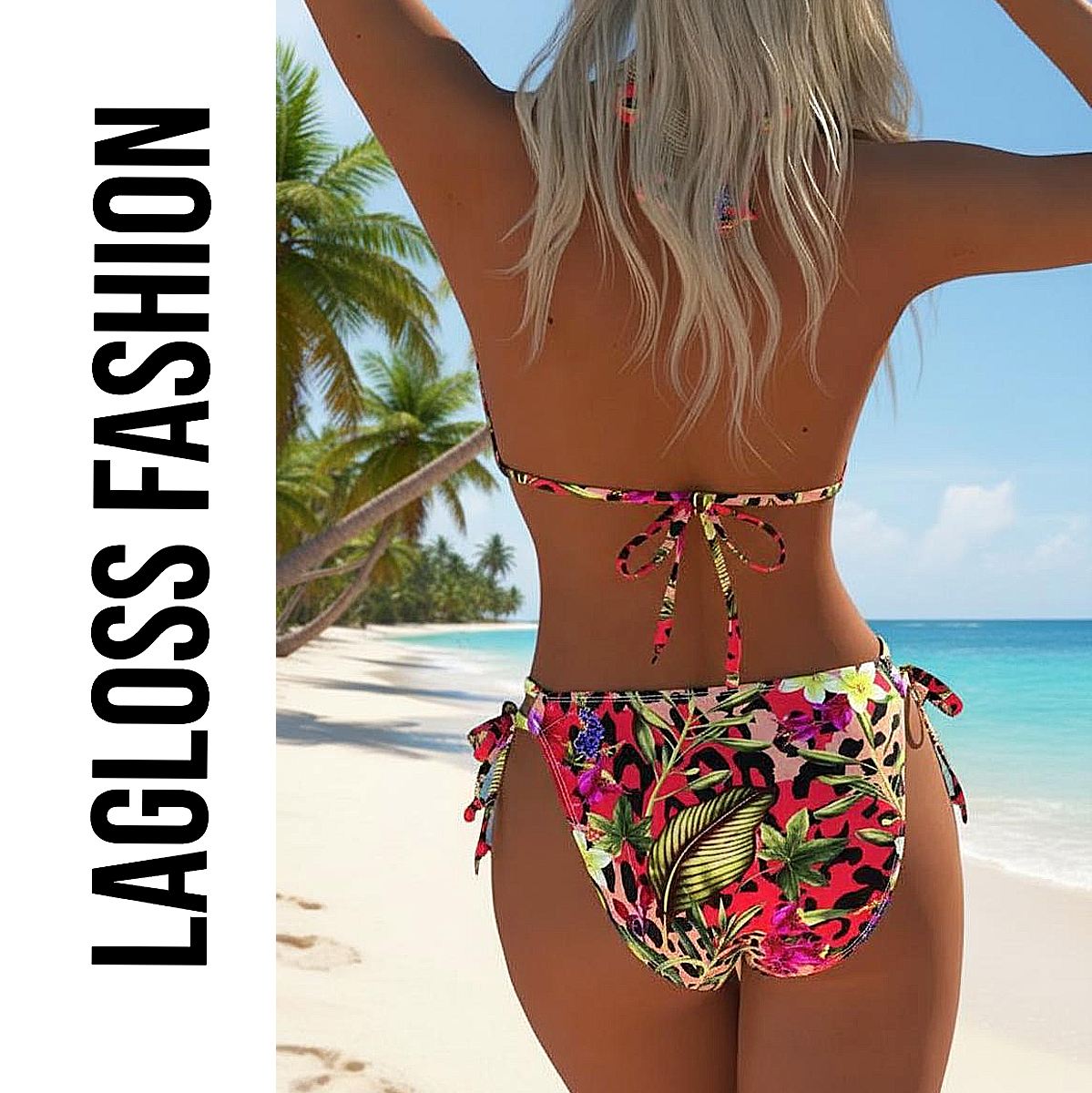 LaGloss® Kleurige Bloemenprint Bikini Set – Tweedelig Badpak met V-Hals, Halterband & Hoge Split – Hoogelastische Stof – Kleurrijke Zomerse Strandbikini – Maat S