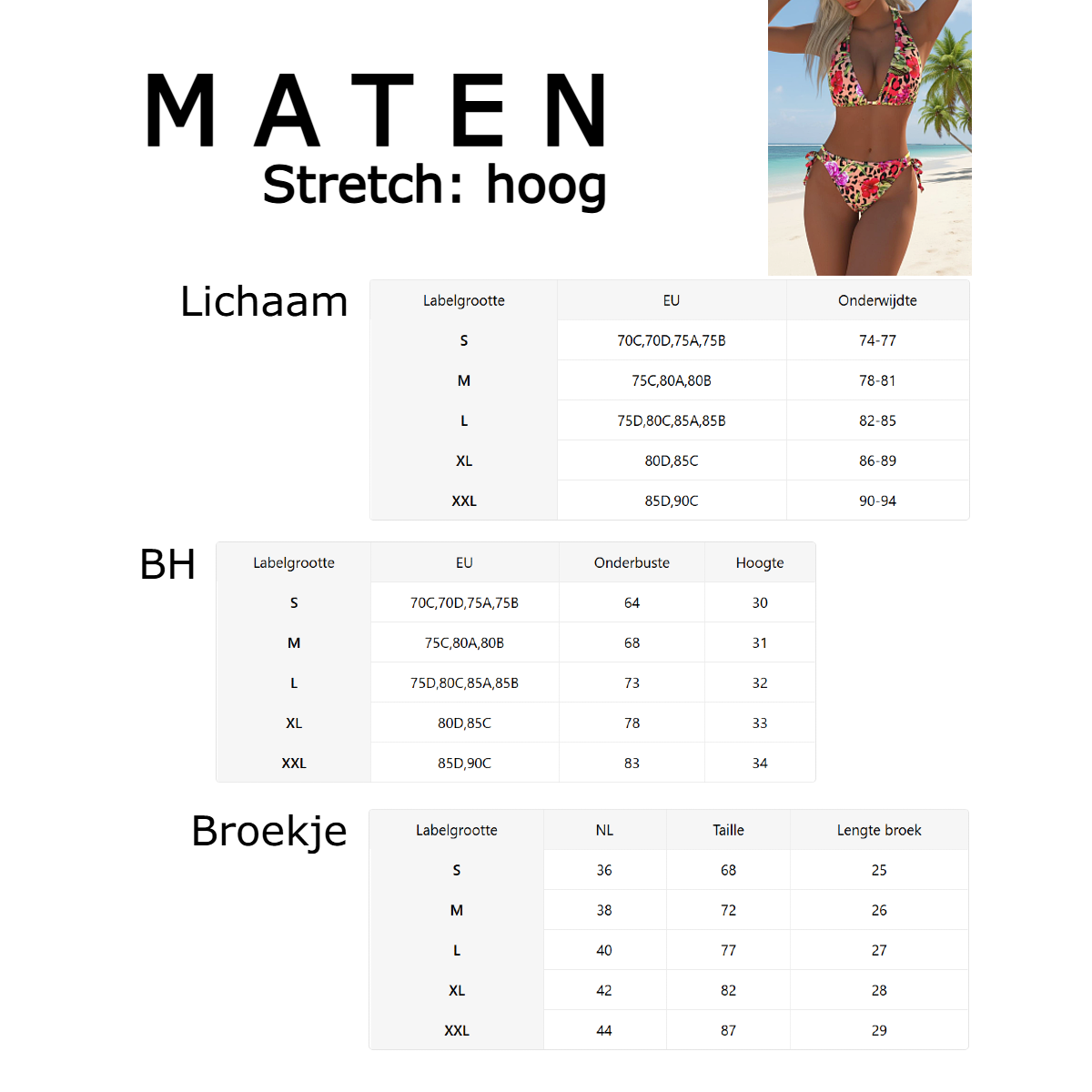 De bikini is gemaakt van hoog elastische stof (82% polyester, 18% elastaan) die zorgt voor ultiem draagcomfort en perfecte bewegingsvrijheid. De kleurrijke bloemenprint geeft deze bikini een frisse, zomerse uitstraling – ideaal voor wie houdt van vrolijke en levendige designs.