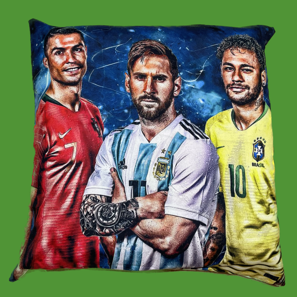 Een prachtige, hoogwaardige en kleurrijke kussenhoes met rits (zonder binnenkussen) van deze 3 voetbal legendes Ronaldo Messi Neymar.