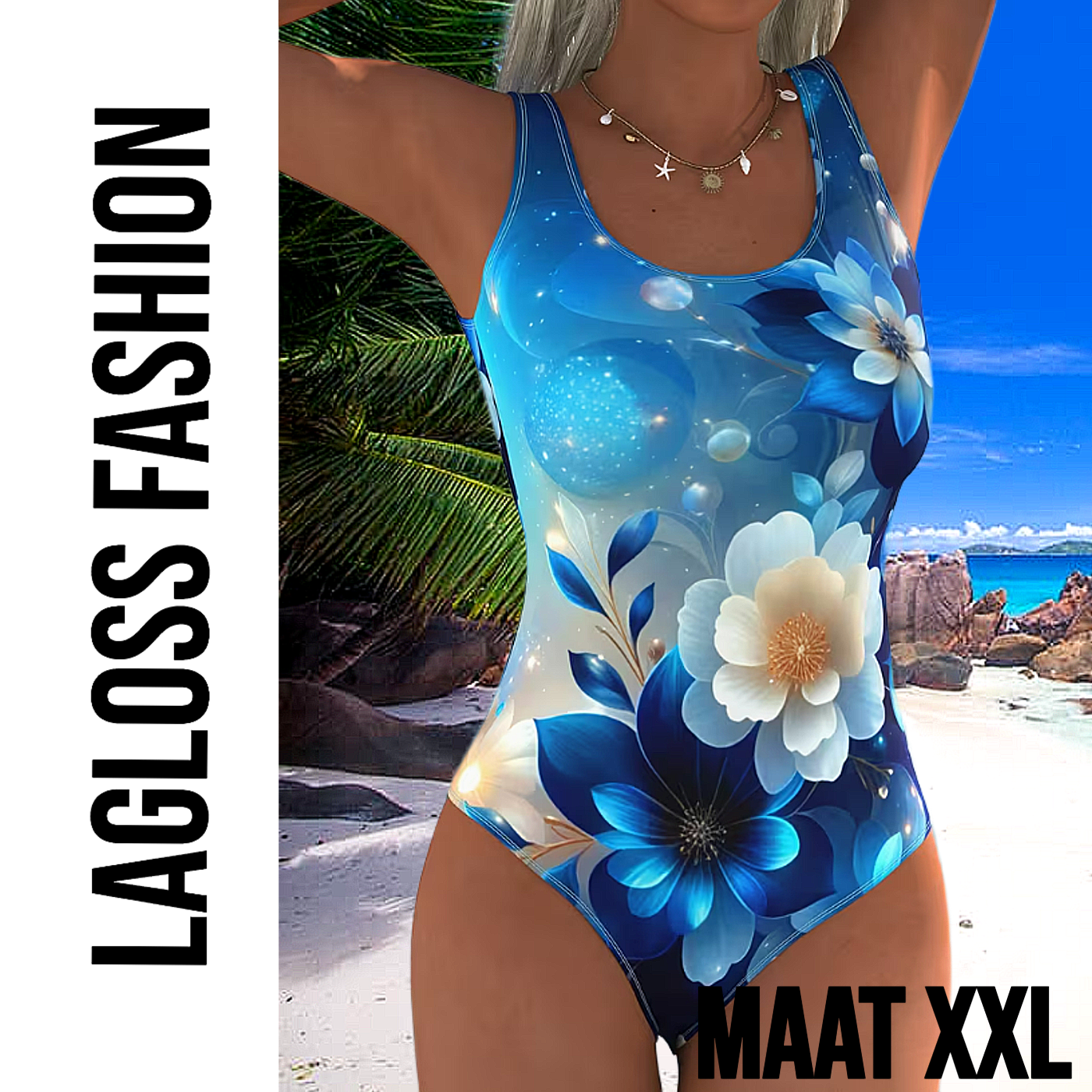 LaGloss® Eendelig Blauw-Witte Bloemen Dames Badpak met Open Rug - Sexy Zwempak – Badkleding – Strandmode – Beach Fashion – Maat XXL