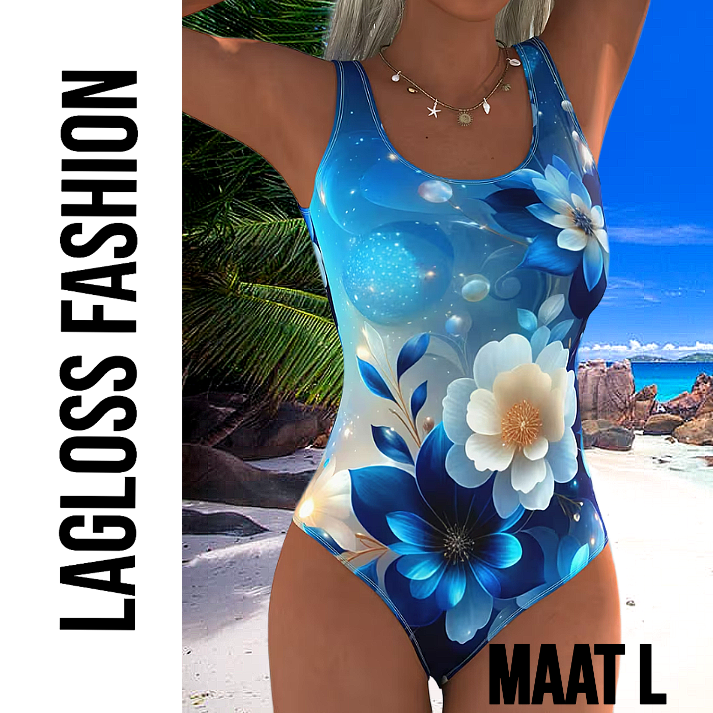 LaGloss® Eendelig Blauw-Witte Bloemen Dames Badpak met Open Rug - Sexy Zwempak – Badkleding – Strandmode – Beach Fashion – Maat L