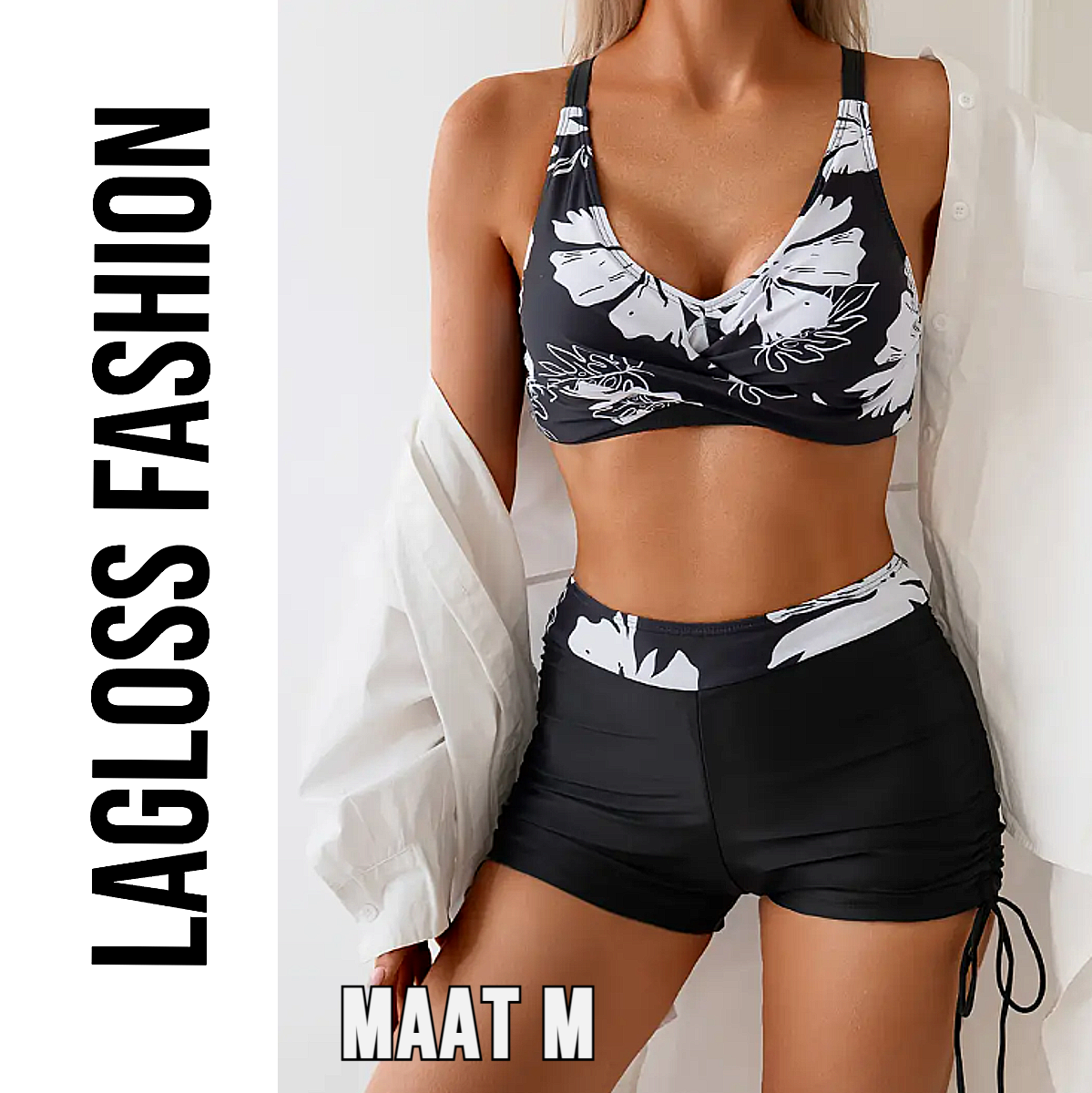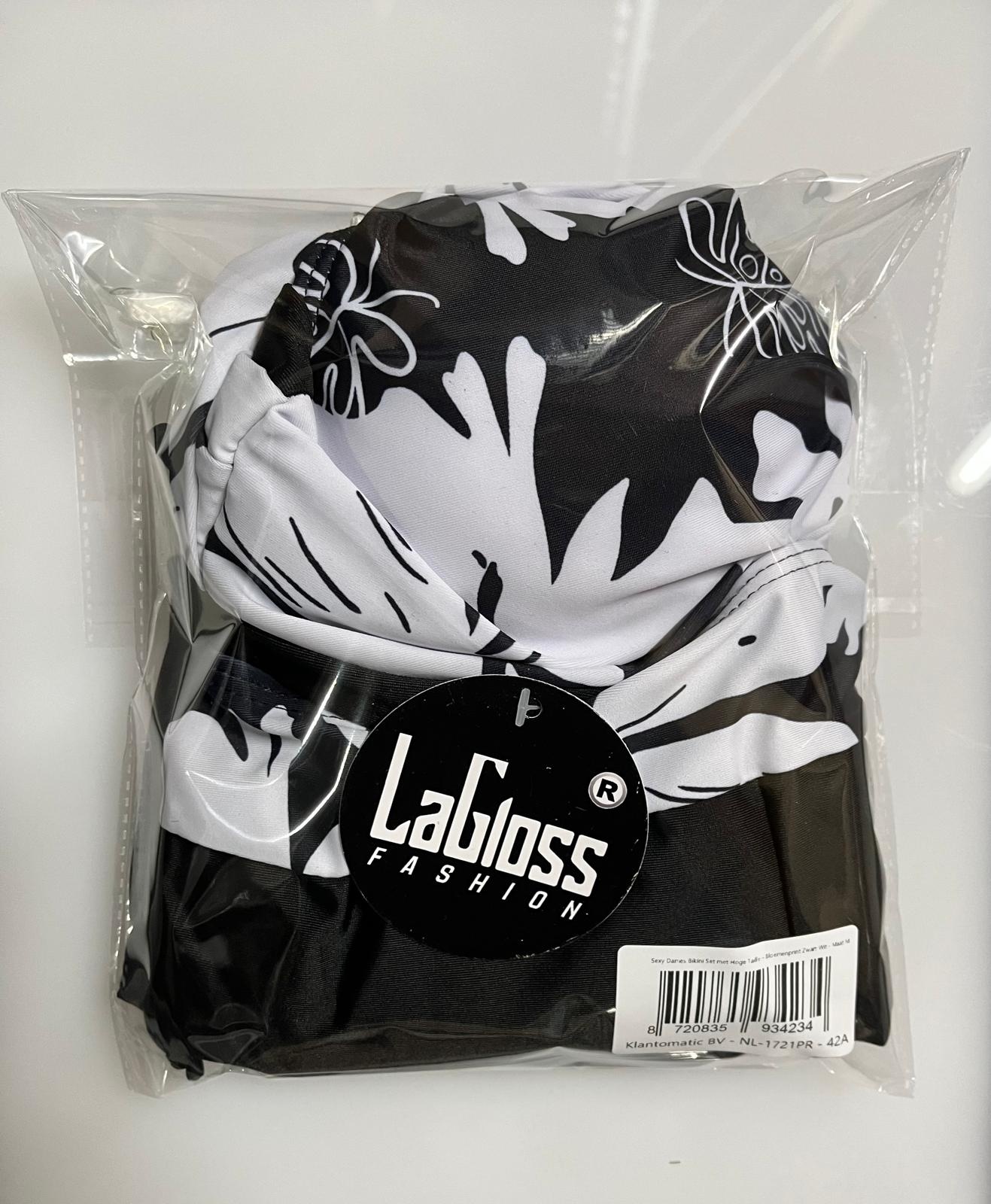LaGloss® Sexy Dames Bikini Set met Hoge Taille – Bloemenprint, Buikcontrole & Trekkoord – 2-Delige Badkleding met Korte Pijpjes – Zwart Wit - Maat M