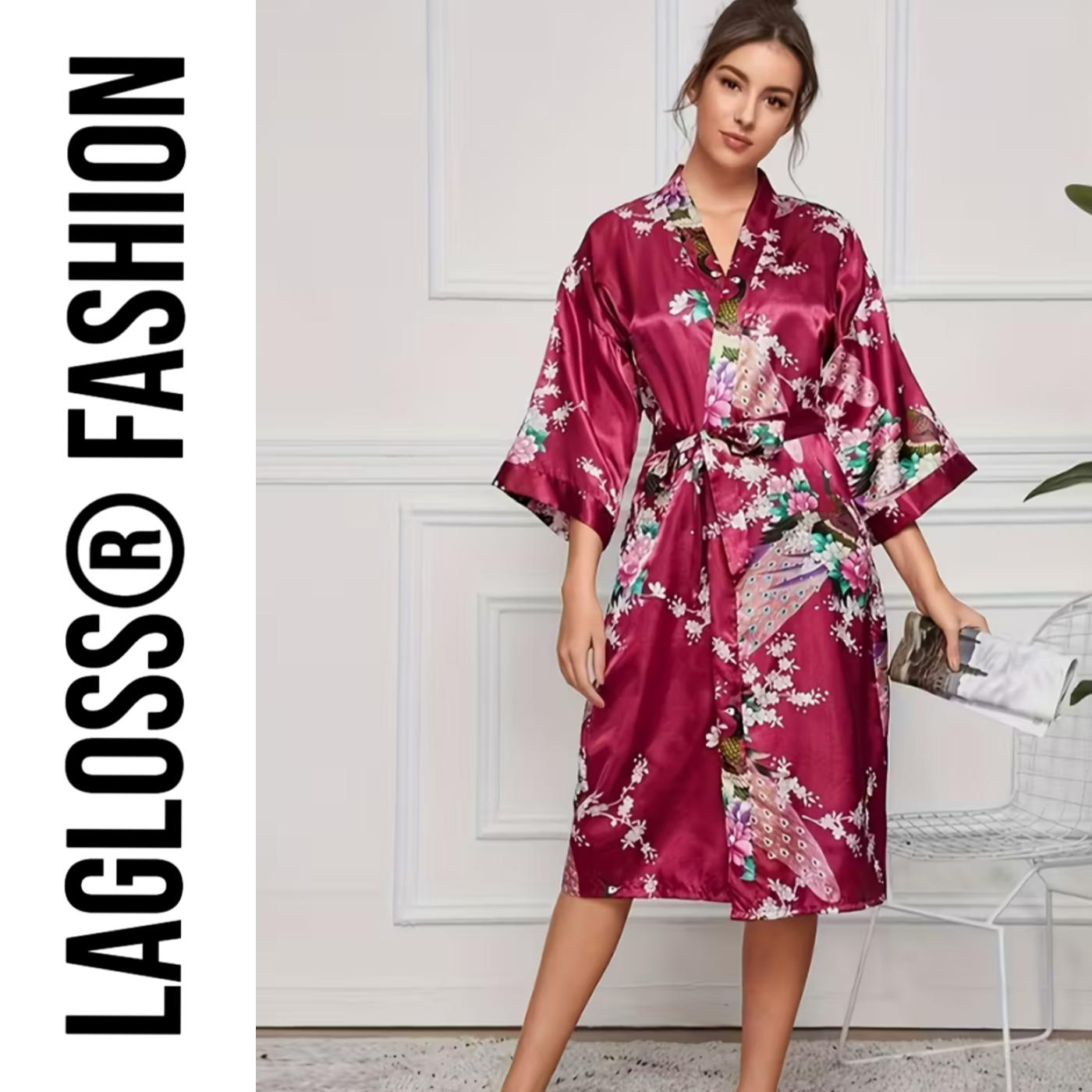 LaGloss® Lange Damesbadjas Karmozijnrood met Bloemen- en Pauwenprint – Ochtendjas – Nachtkleding – Maat M