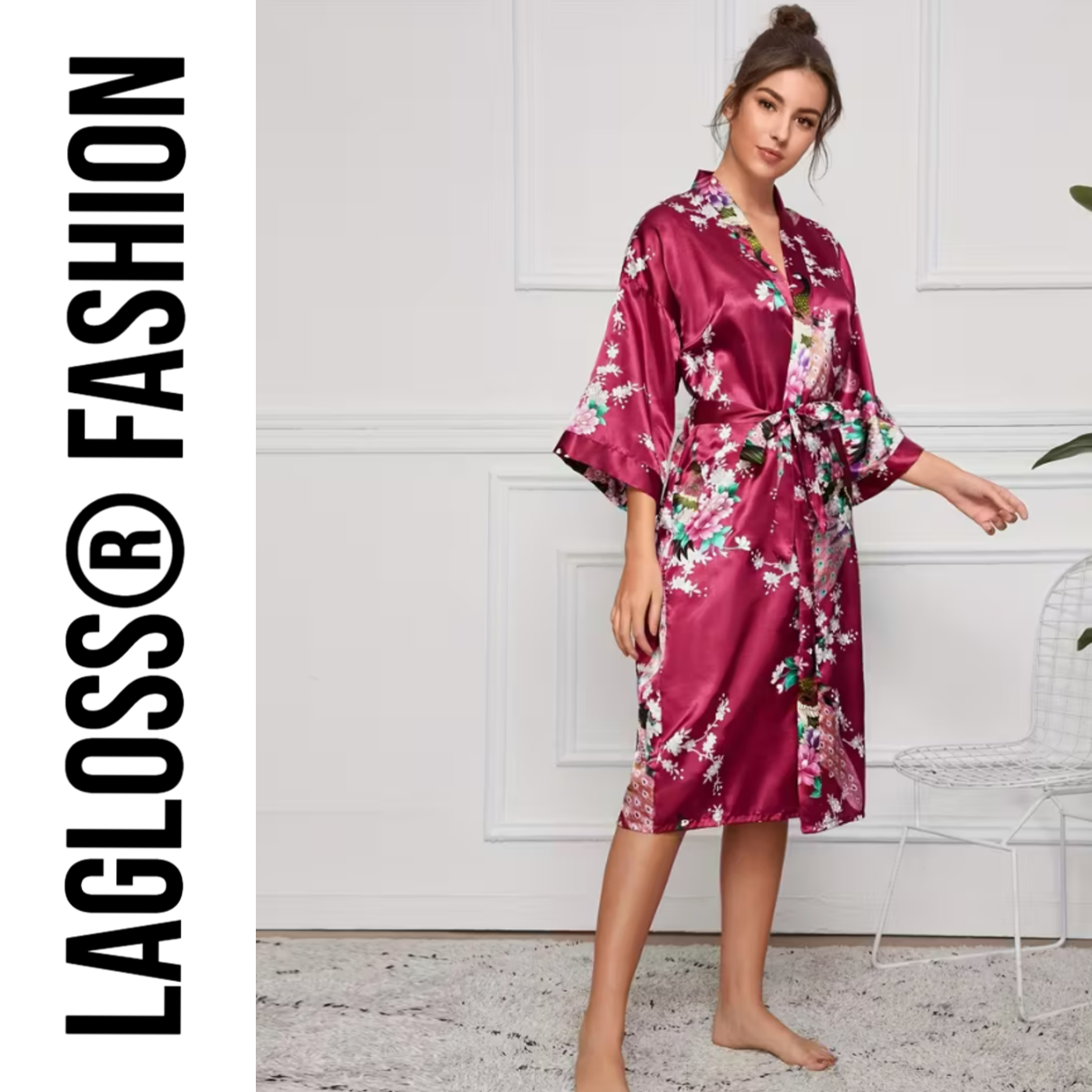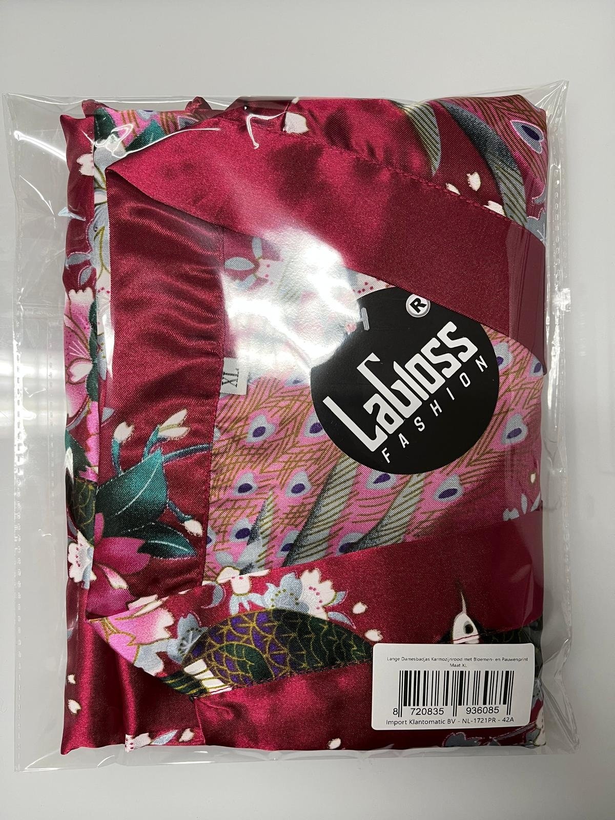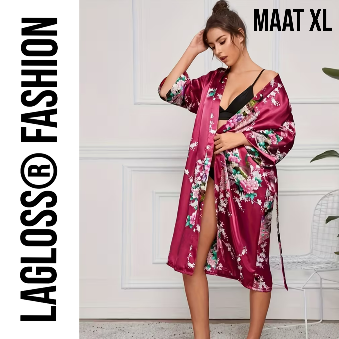 LaGloss® Lange Damesbadjas Karmozijnrood met Bloemen- en Pauwenprint – Ochtendjas – Nachtkleding – Maat XL