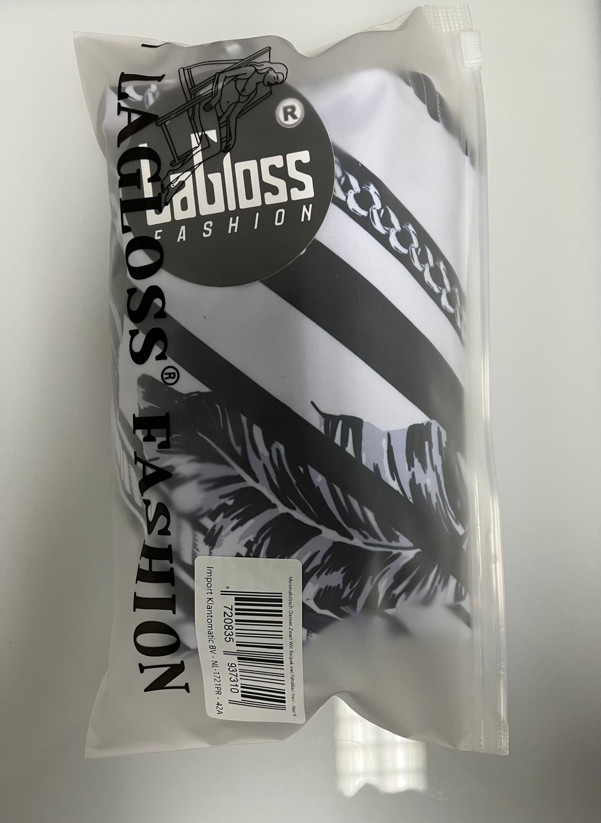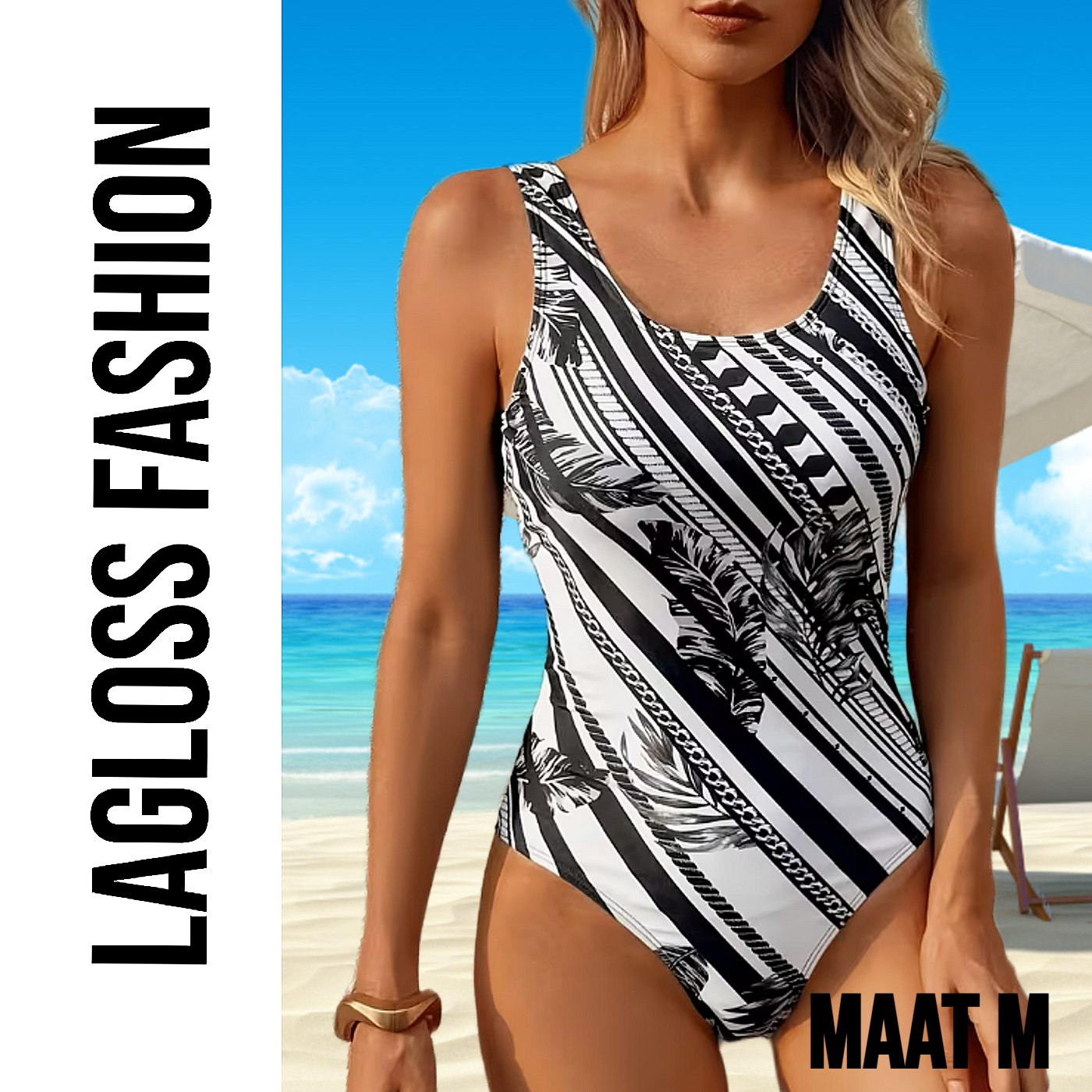 LaGloss® Minimalistisch Dames Zwart Wit Badpak met Palmblad Print - Vierkante Hals Zwart Wit Gestreept - Open Rug – Maat M