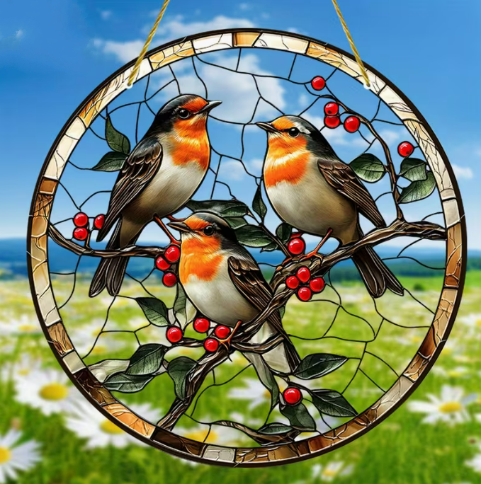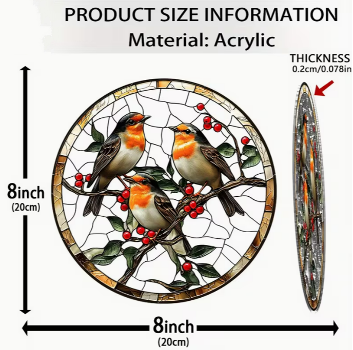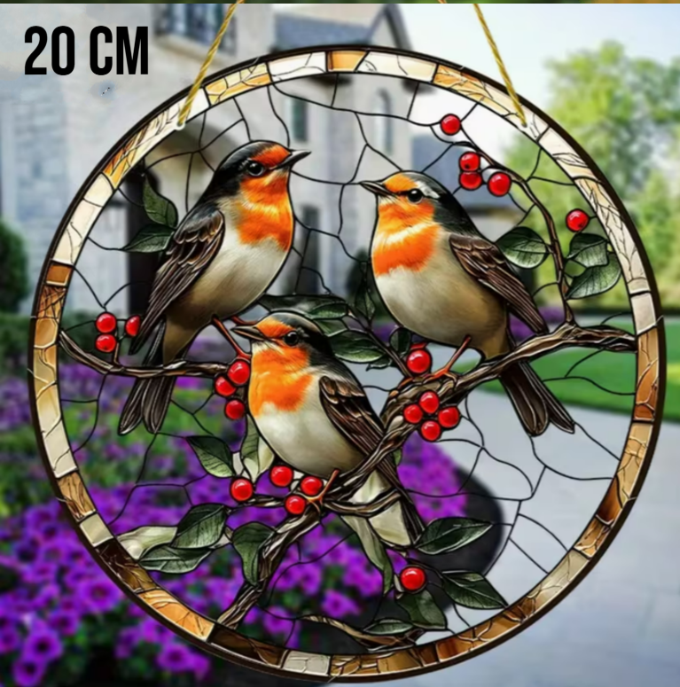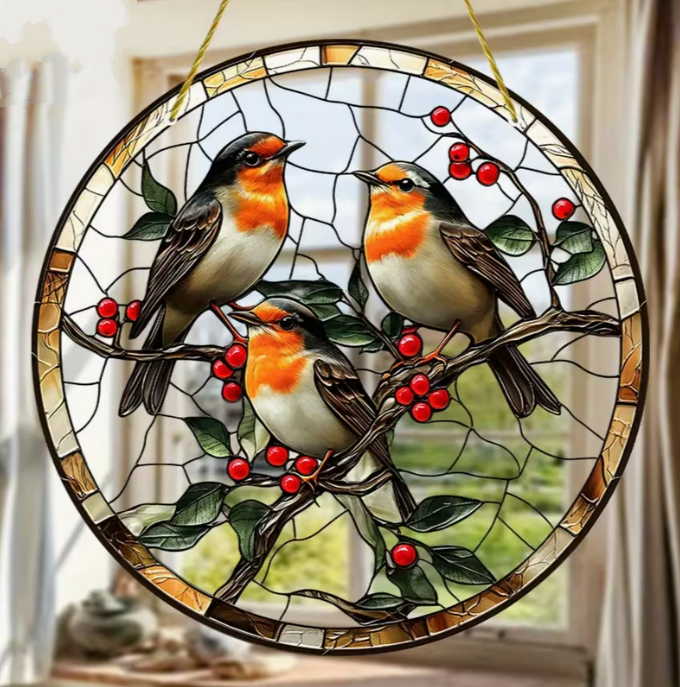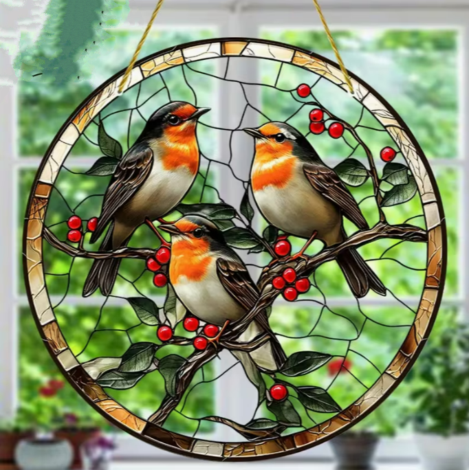 Breng warmte, natuur en symboliek in uw interieur met deze prachtige raamhanger met drie roodborstjes, vervaardigd uit hoogwaardig dubbelzijdig bedrukt acryl. De levendige kleuren en verfijnde glas-in-lood stijl zorgen voor een schitterend lichteffect wanneer de zon door het ontwerp schijnt, waardoor uw raam verandert in een sfeervol kunstwerk.