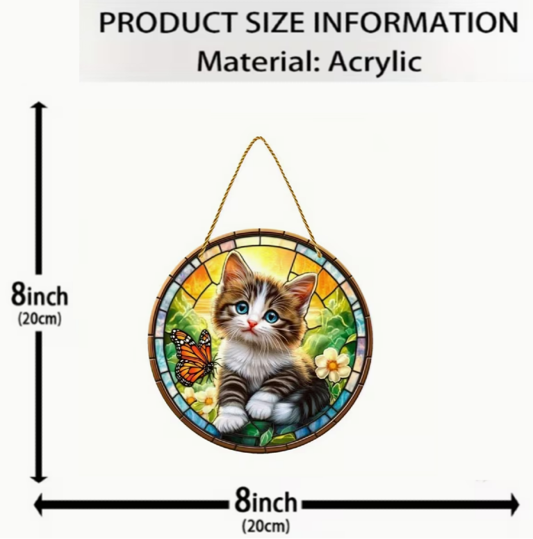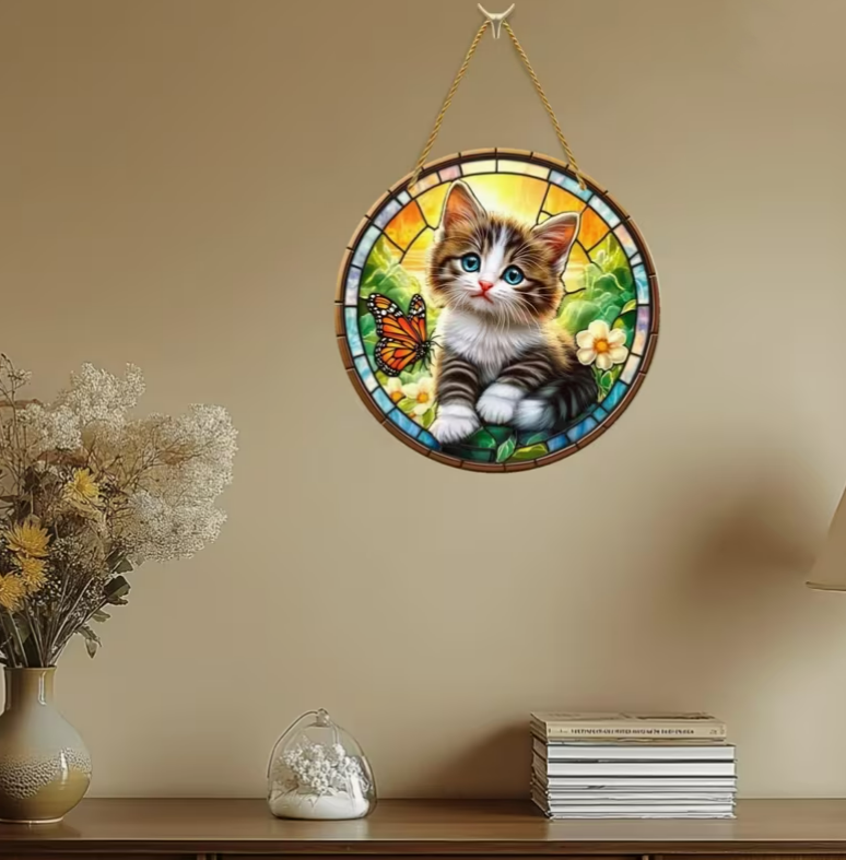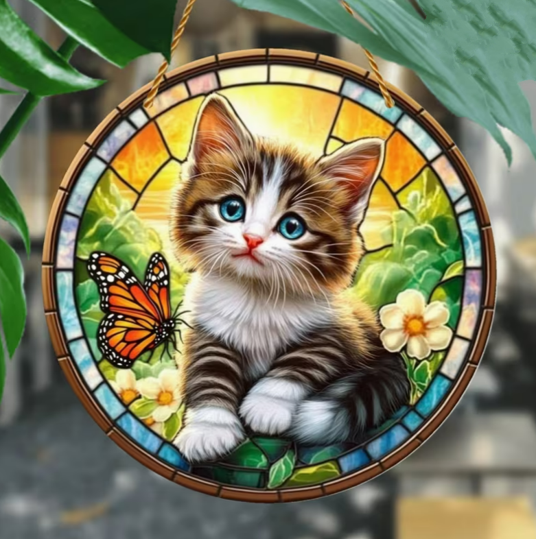 Breng een speelse en warme sfeer in uw interieur met deze betoverende raamhanger van een schattig kitten met een sierlijke vlinder, vervaardigd uit hoogwaardig dubbelzijdig bedrukt acryl. De levendige kleuren en glas-in-lood look zorgen voor een prachtig lichteffect wanneer de zon door het ontwerp schijnt, waardoor uw ruimte direct tot leven komt.