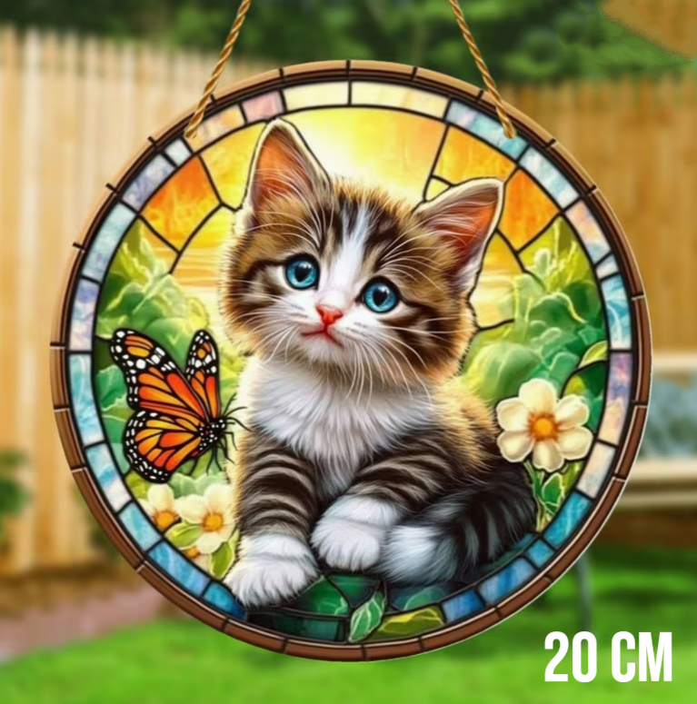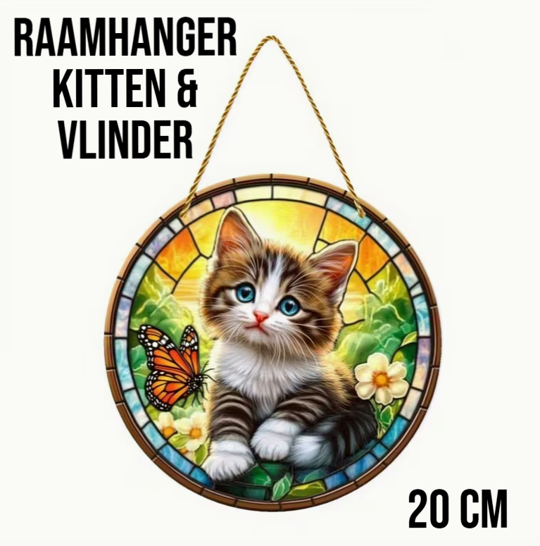 Het tafereel van een schattig poesje dat en een mooie vlinder straalt rust, speelsheid en harmonie uit. Deze combinatie symboliseert nieuwsgierigheid, vrijheid en het genieten van kleine momenten. Hierdoor is deze raamhanger niet alleen decoratief, maar ook een betekenisvolle toevoeging aan uw woonruimte.