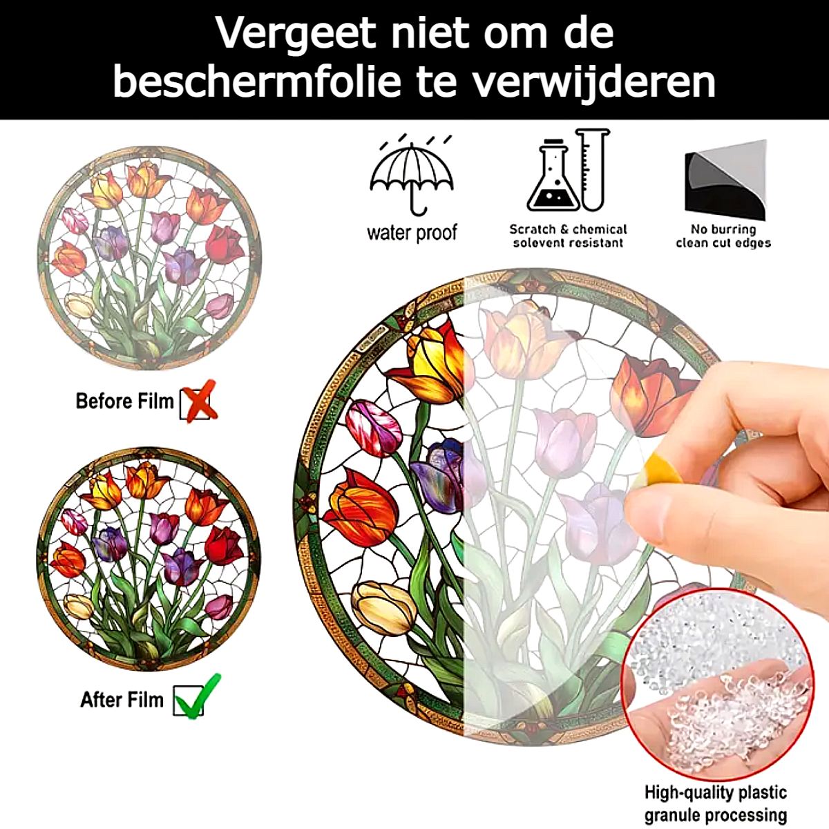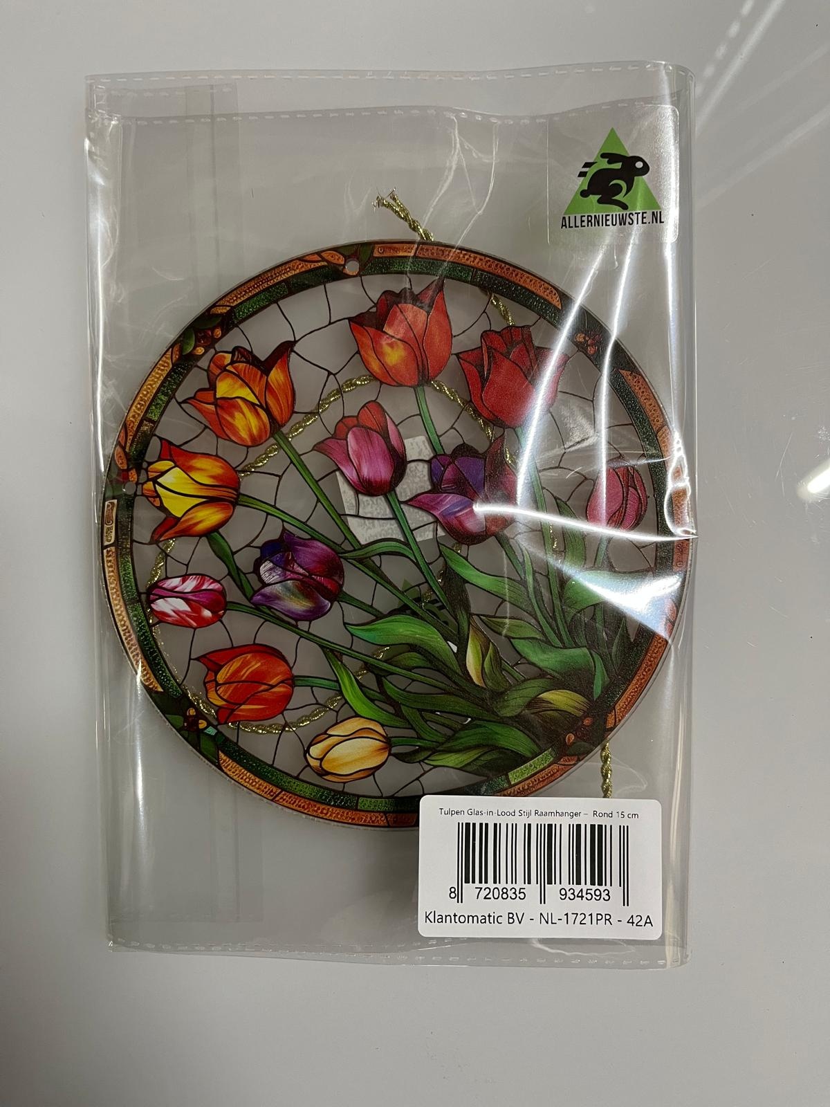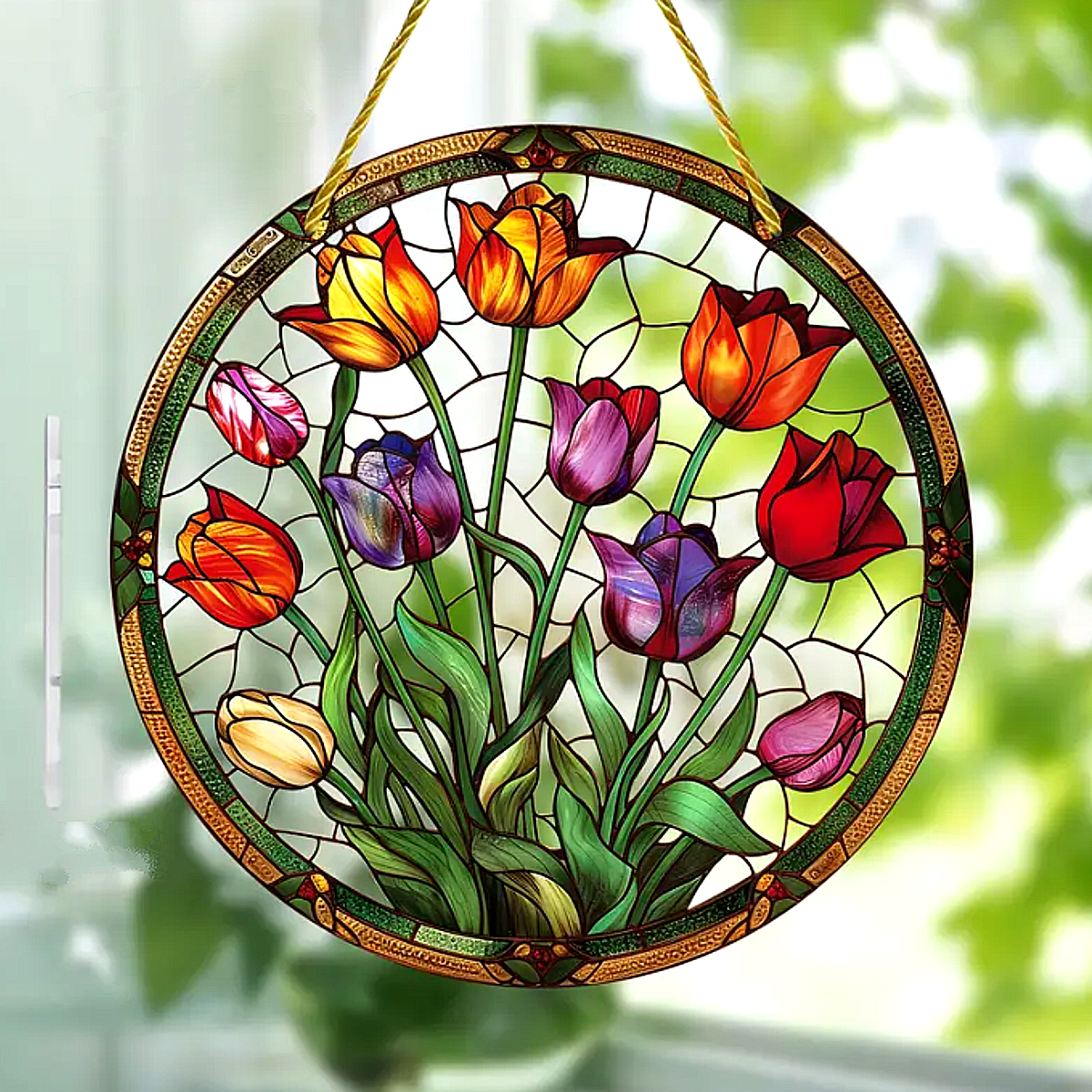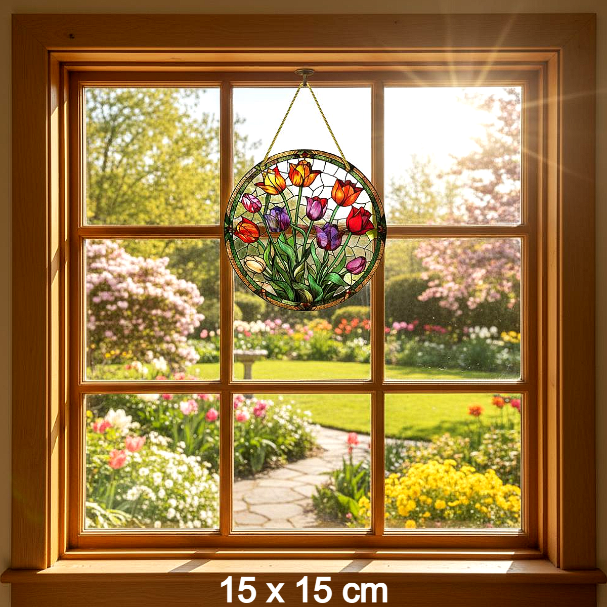 Tulpen Glas-in-Lood Stijl Raamhanger - Bloemen Raamdecoratie – Rond 15 cm – Acryl Zonvanger met Koord - 15 x 15 cm