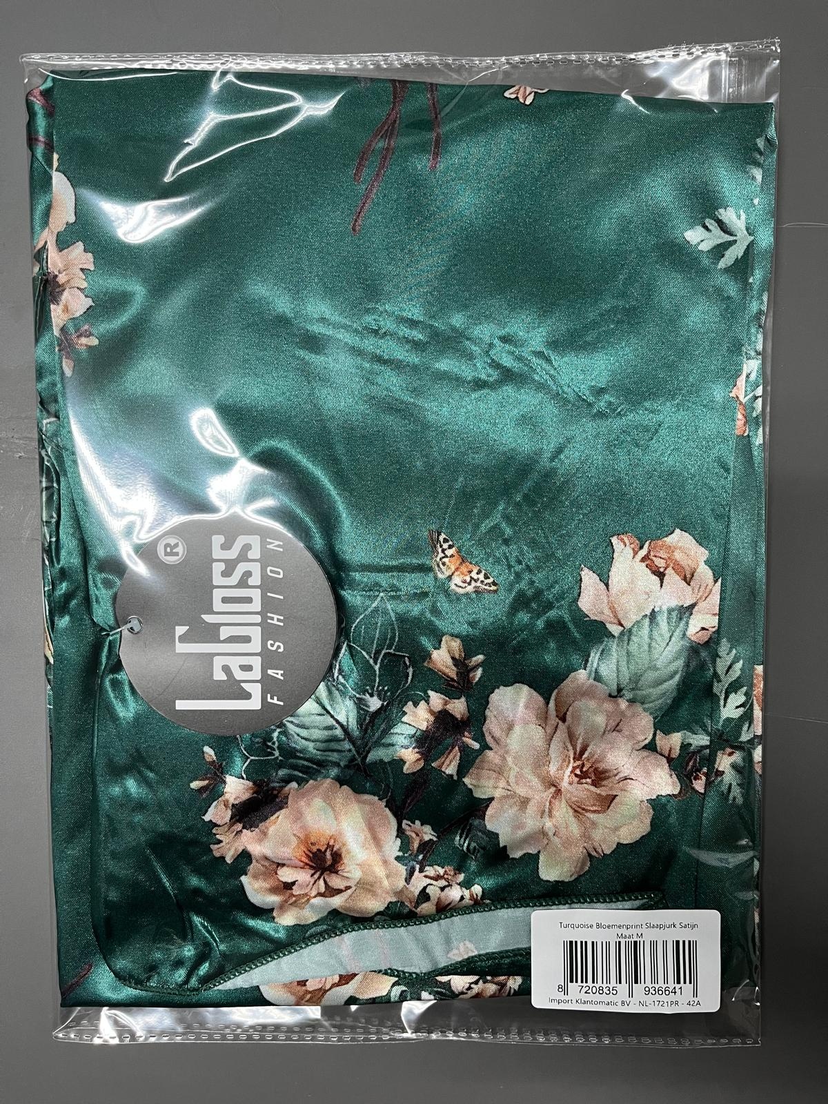 LaGloss® Turquoise Bloemenprint Slaapjurk Satijn – Mouwloos & Elegant Lente/Zomer – Maat M