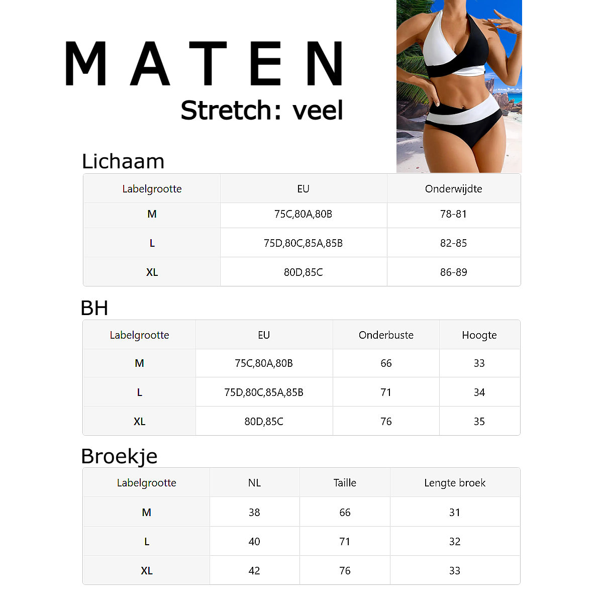 De top heeft een ondersteunende, maar zachte pasvorm, ideaal voor zowel loungen aan het zwembad als actieve stranddagen. Dankzij het hoog elastisch materiaal van 80% Polyamide en 20% elastaan sluit de bikini mooi aan en biedt hij voldoende bewegingsvrijheid. De contrastdetails zorgen voor een visueel slankmakend effect, wat deze bikini perfect maakt voor vrouwen die een elegante maar opvallende look zoeken.