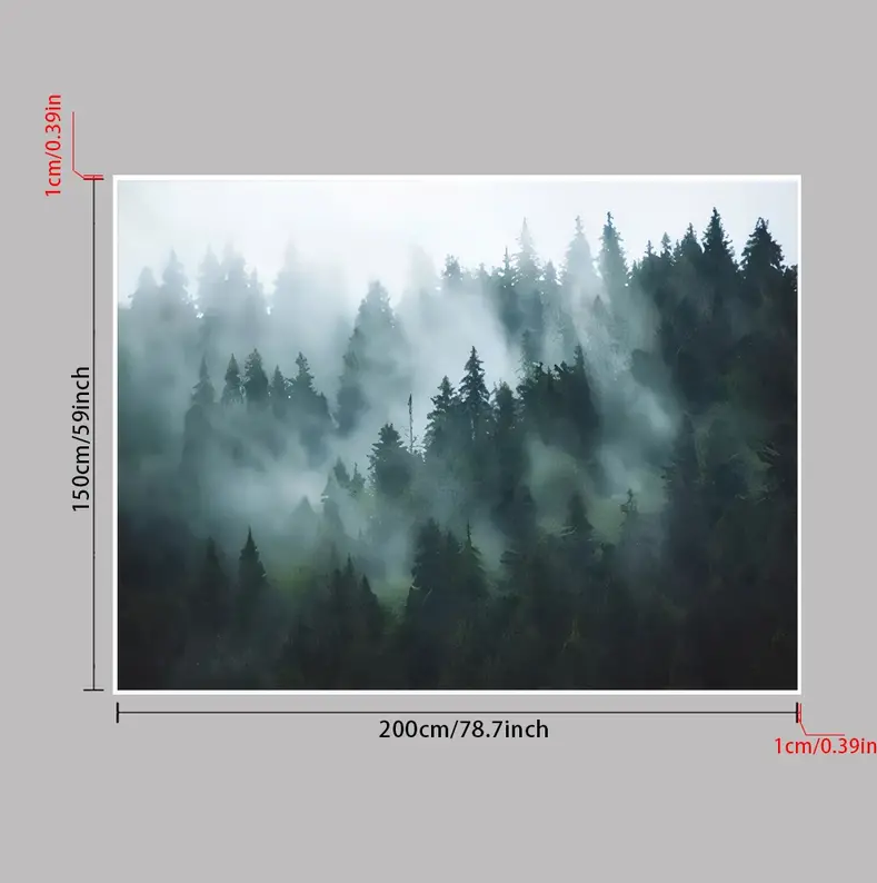 Het wandkleed is vervaardigd uit hoogwaardig polyester, wat niet alleen zorgt voor een luxe uitstraling, maar ook voor duurzaamheid en onderhoudsgemak. Dankzij het gebruik van polyester blijven de levendige kleuren en het gedetailleerde ontwerp van het mistige bos helder en scherp, zelfs na langdurig gebruik. Dit wandkleed voelt zacht aan en voegt een elegante touch toe aan elk interieur.