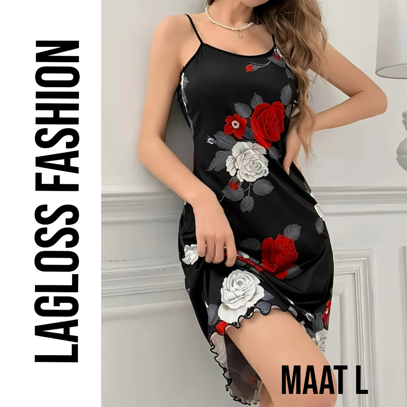 LaGloss® Zwarte Camisole Nachtjurk met Bloemenprint – Spaghettibandjes & Ronde Hals – Maat L
